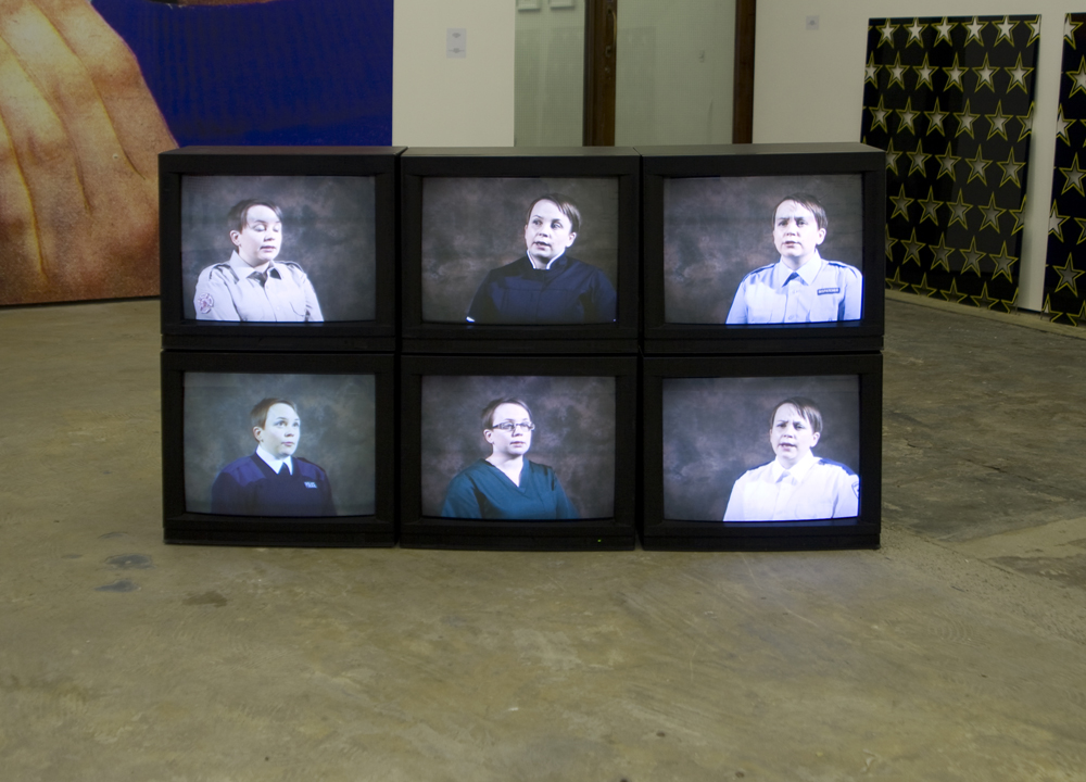 State of Emergency (2010) is a 6 channel installation, it’s based on interviews transcribed from Rescue 911 (1989 -1996), an American docu-drama from the 1990’s about real life rescues. Cecilia plays six characters, all based on different members of the Emergency services: the 911 Dispatcher, The Police officer, The Paramedic, The Fireman, the Doctor and The Nurse. The re-enacted interviews, placed on a grid, generate a continuous state of emergency.