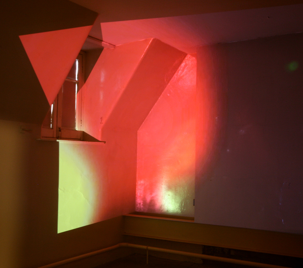 The Scene (2010) is a silent video animation that recalls the effect made by diffused coloured light spilling through a window and trailing around a room from a nearby emergency vehicle warning light. This familiar imagery as likely to occur outside your home as on your TV screen prompts a poignant moment of reflection that as with other works by Stenbom treads a fine line between fiction and reality.