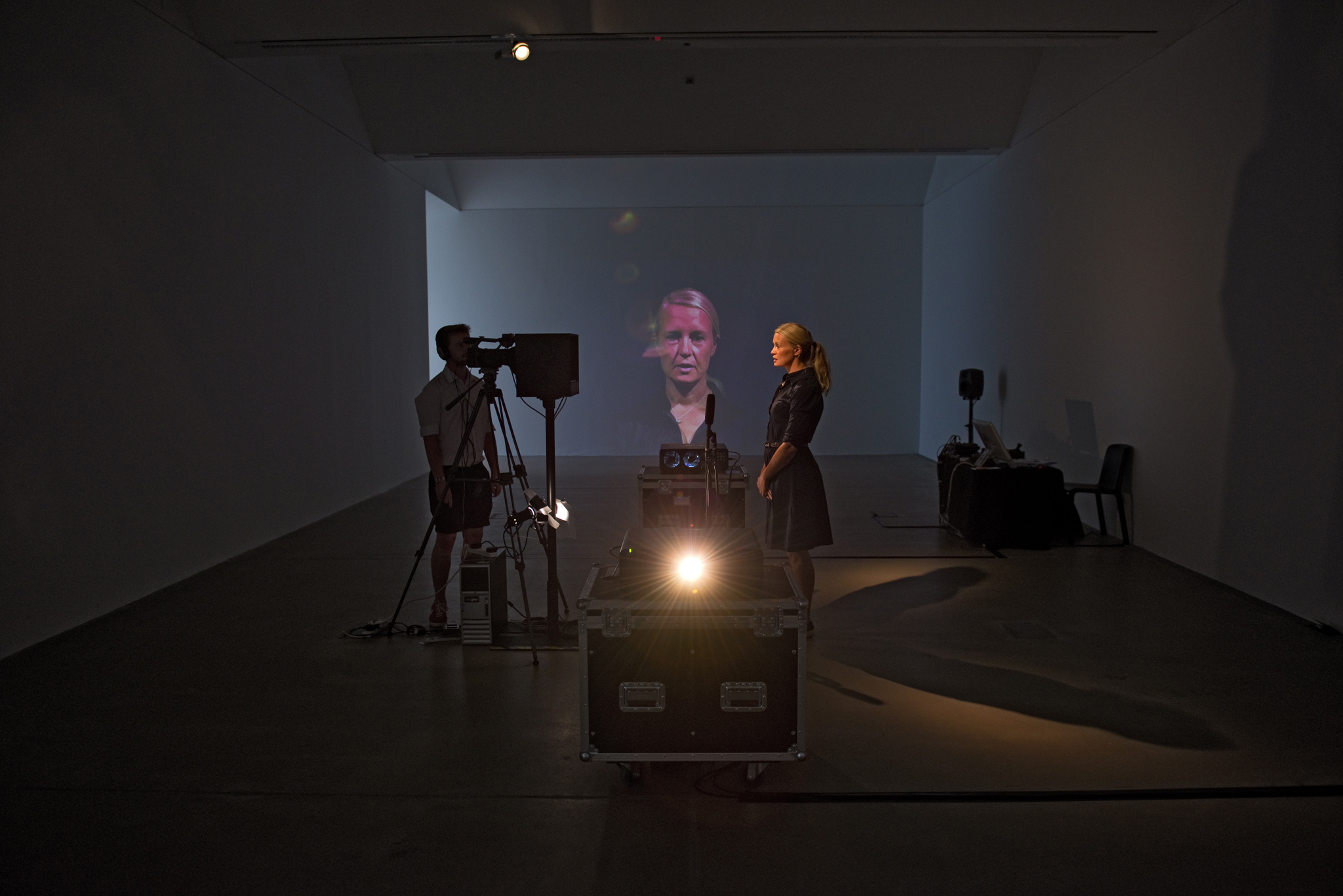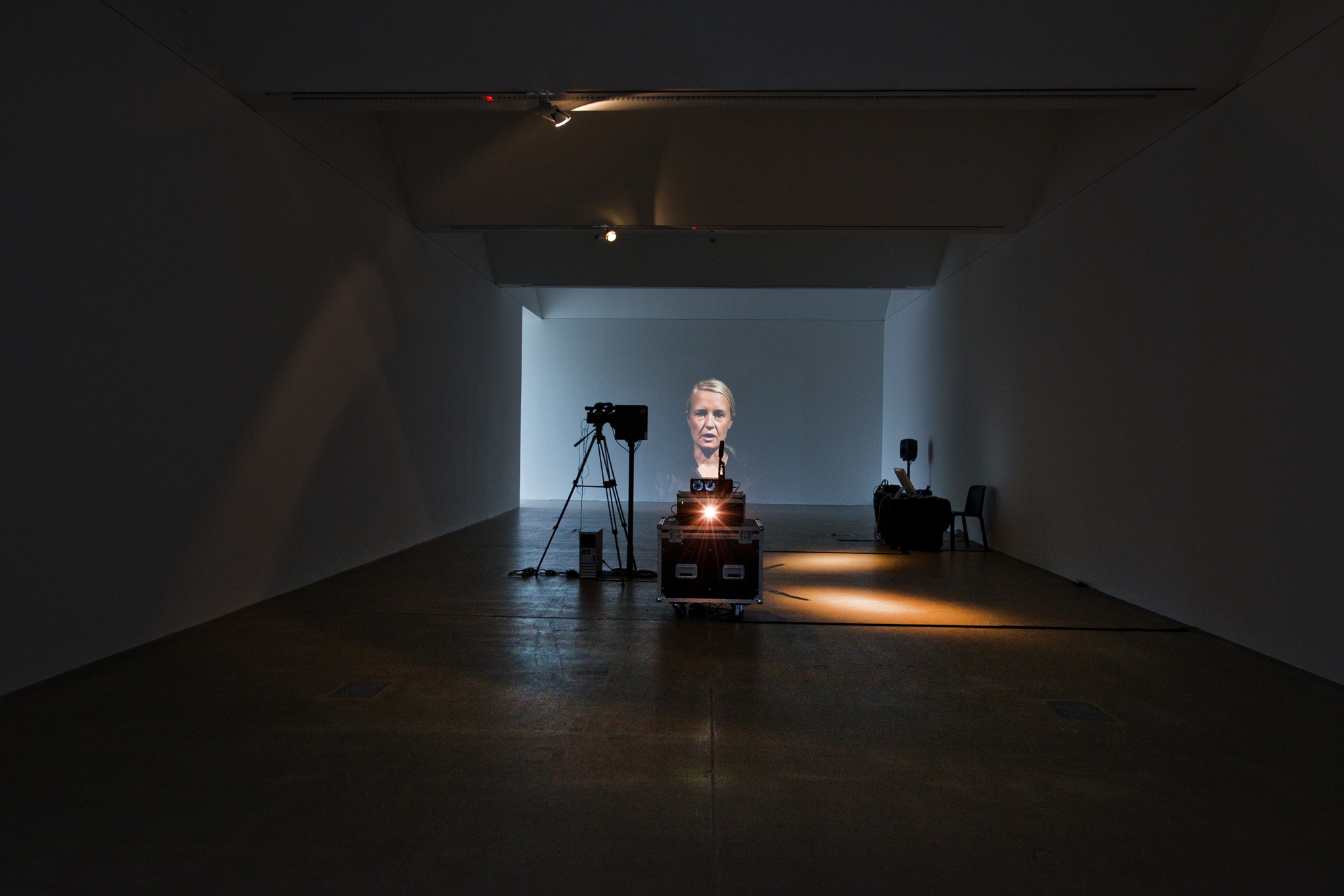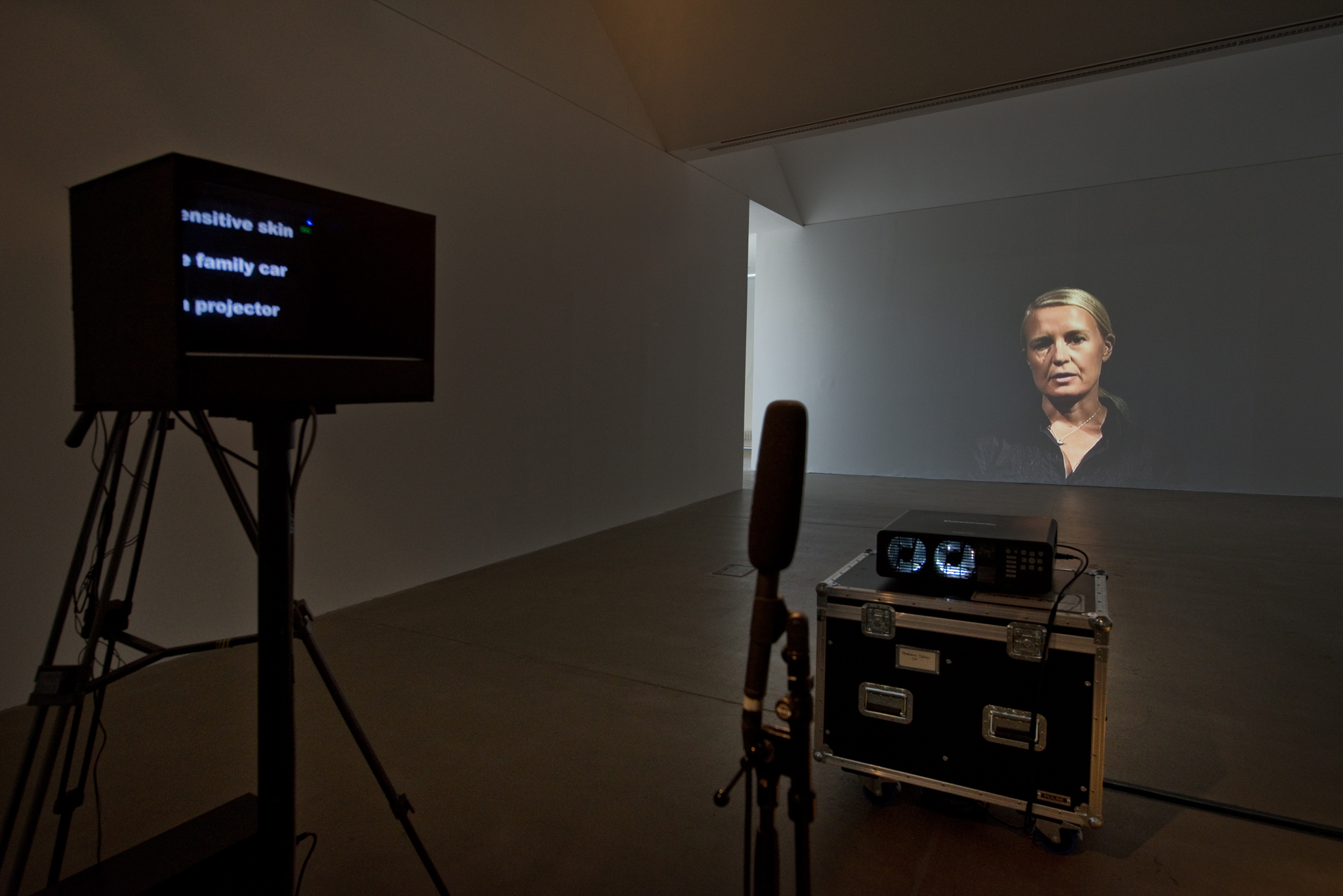 Each day there will be a performance in which an actor enters the gallery, stands on a mark in front of a camera, and delivers the list with the aid of a teleprompter. Once the actor is finished, the footage will be captured and projected back into the space, representing the list as an endless audio-visual loop that surrounds the scrolling teleprompter and the actor’s mark.