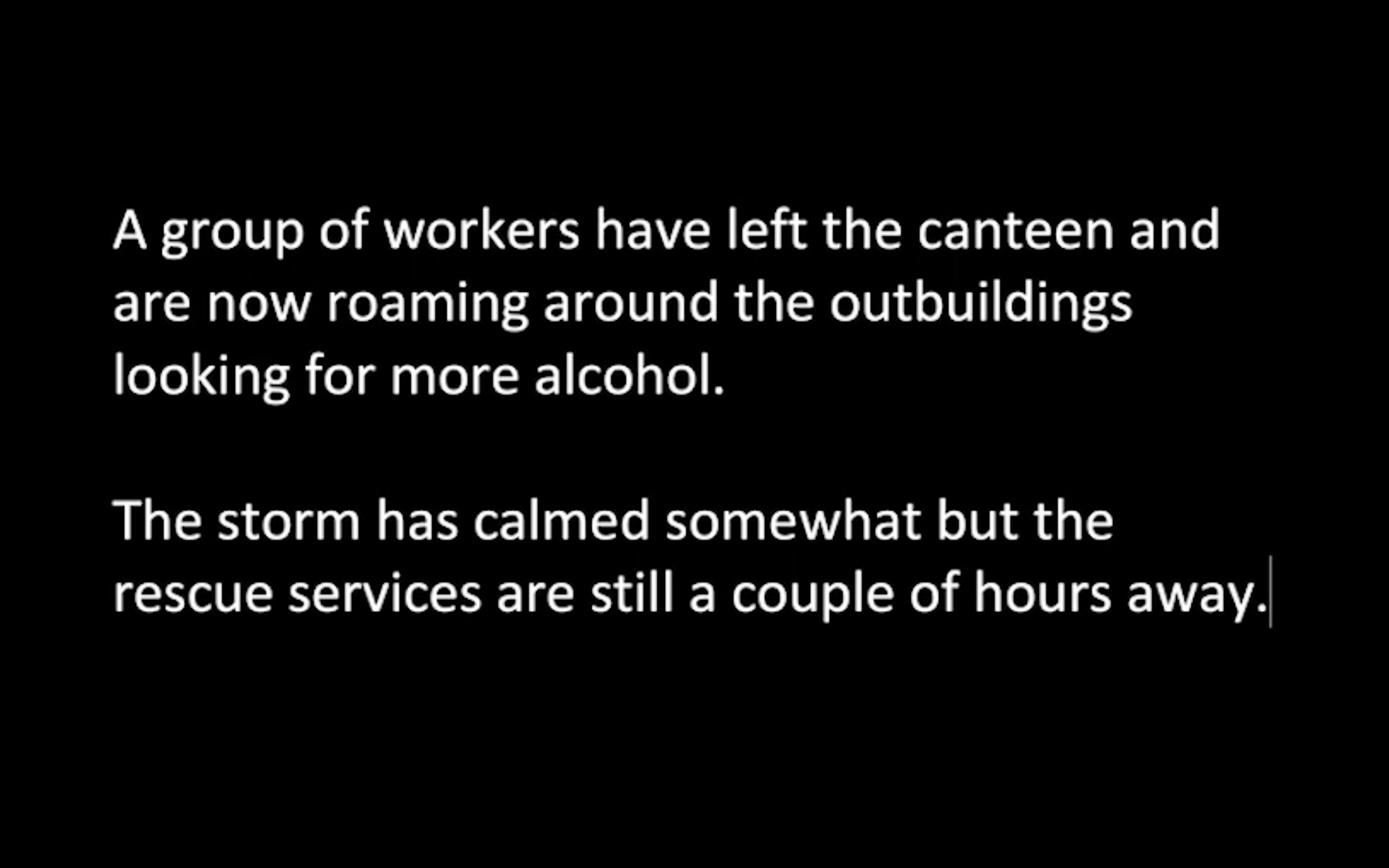 The situation room exercise was led by an Actor-Facilitator with three participating actors who were asked to assume professional roles within a fictitious organisation. The situation room simulated a crisis with taskforce in charge of preventing an environmental disaster at a manufacturing plant. Dramatic twists and moral dilemmas, skewed towards the ridiculous, pressure the participants to act under pressure in an exercise designed to test participants in crisis management and challenge them in terms of accountability and empathetic response.